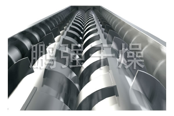 空心轴上密集排列着楔型中空浆叶,热介质经空心轴流经浆叶。单位有效容积内传热面积很大,热介质温度从-40℃到320℃,可以是水蒸汽,也可以是液体型:如热水、导热油等。间接传导加热,没有携带空气带走热量,热量均用来加热物料。热量损失仅为通过器体保温层向环境的散热。楔型浆叶传热面具有自清洁功能。物料颗粒与楔型面的相对运动产生洗刷作用,能够洗刷掉楔型面上附着物料,使运转中一直保持着清洁的传热面。浆叶干燥机的壳体为Ω型,壳体内一般安排二到四根空心搅拌轴。壳体有密封端盖与上盖,防止物料粉尘外泄而充分发挥作用。