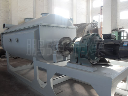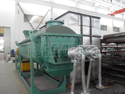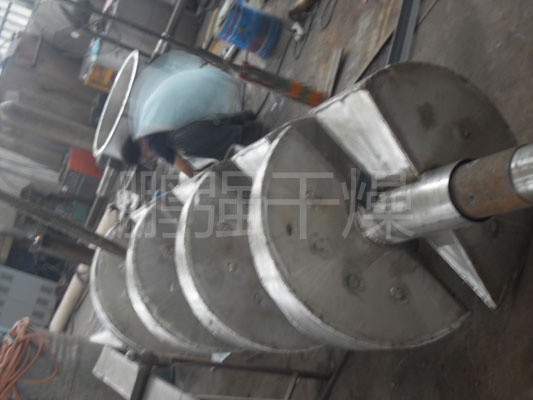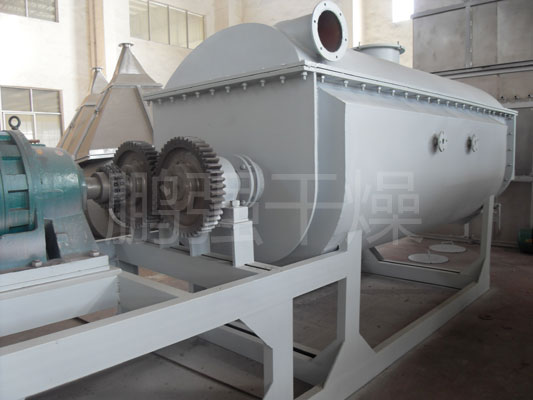 空心轴上密集排列着楔型中空浆叶,热介质经空心轴流经浆叶。单位有效容积内传热面积很大,热介质温度从-40℃到320℃,可以是水蒸汽,也可以是液体型:如热水、导热油等。间接传导加热,没有携带空气带走热量,热量均用来加热物料。热量损失仅为通过器体保温层向环境的散热。楔型浆叶传热面具有自清洁功能。物料颗粒与楔型面的相对运动产生洗刷作用,能够洗刷掉楔型面上附着物料,使运转中一直保持着清洁的传热面。浆叶干燥机的壳体为Ω型,壳体内一般安排二到四根空心搅拌轴。壳体有密封端盖与上盖,防止物料粉尘外泄而充分发挥作用。