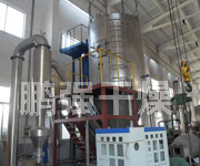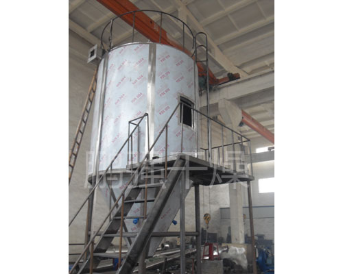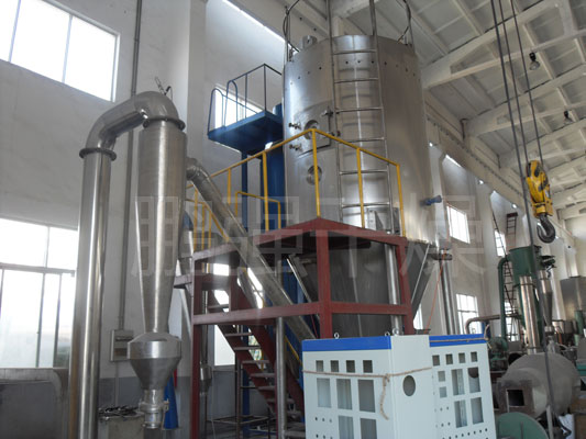 空气经过滤和加热,进入干燥器顶部空气分配器,热空气呈螺旋状均匀地进入干燥室。料液经塔体顶部的高速离心雾化器,(旋转)喷雾成极细微的雾状液珠,与热空气并流接触在极短的时间内可干燥为成品。成品连续地由干燥塔底部和旋风分离器中输出,废气由风机排空。