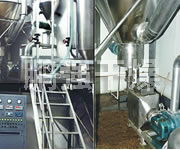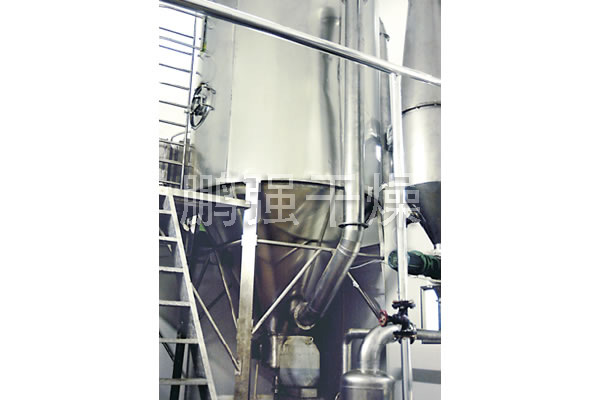 该机采用全封闭形式,所有部件均采用不锈钢制造,配有三级净化装置,过滤后的空气达十万级要求。筒体与顶部装有冷壁装置,使壁温<80℃,干燥塔内装有气刷扫塔装置。经该机干燥后的中药浸膏粉,不会出现焦化变质现象,大大增加了收粉率(95%以上),而且不会产生混药现象和粘壁现象。